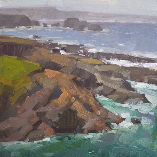 This scene is the view from a winery near Mendocino, CA. (what a view, huh?!) My friend and I positioned ourselves up on a cliff in a spot where it wasn't quite so windy, but by the end I have to admit I was a bit frazzled, and cold. This was after my umbrella turned completely inside out and nearly blew me and all my gear off the cliff. Let me just say - painting moving water is hard! And clearly I have much to learn. But I captured the feeling, of the mist and the rocks and the waves, and for that (and for surviving the experience), I am proud.