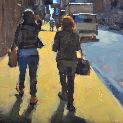The photo reference for this one (from NYC) was a bit dull and gray, so I decided to liven it up. As soon as I decided that, the sidewalk started screaming to be yellow. And the street, blue. Apparently they don't talk until you give them permission.