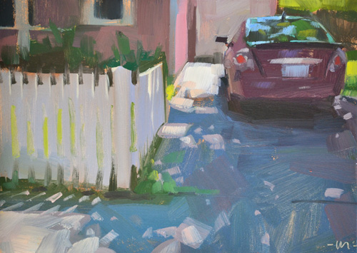 This is a little scene from around my town (Eugene). The fence actually turned out JUST how I wanted it. The approach I took was to paint it as a solid object, really paying attention to the various "whites," like how it gets bluer as it goes around the corner, and gets darker at the bottom-left. And then I cut in around it with the greens, and then put on the little highlights right at the end.