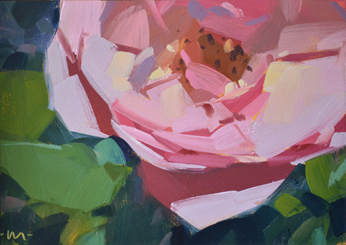 I was writing to my friend Lee today because she said she was inspired to paint some roses. I said, "This is what I've learned [about painting roses] lately - paint the biggest chunks first, totally ignoring (and painting right over) the little chunks. Paint the big chunks with big bold strokes. Squint to see just how big they are. Then after you've got them in, go back and paint the little things (thin petals that you see on edge, and little dark marks where things are folded under) on top of the big strokes, thick enough to cover. When you get to the edges of the rose, be loose so you get some softness (otherwise it looks like a cutout), but make some still a little sharp (variety)."