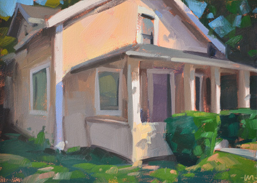 One of the things that came from the "big chunks first" method of yesterday's rose was bolder color from the beginning. I thought, "It works for roses, but does it work for other things?" So I tried it with this house. And I'm really happy with the result!In other news, Daily Paintworks has just added a forum! It's called "DPW art talk," and anyone can participate (you don't have to be a member). But you do have to be registered with DPW (free and easy as pie). I seeded the forum with categories, questions and a few of my own answers, but feel free to add your own answers, and questions too! Once it gets going I'm hoping it will turn into a great place to share all kinds of art info.