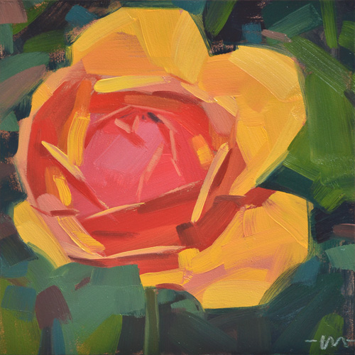 I did this one twice, and was prepared to do it many more times. The first one was sooo boring. I got done and I thought, "ok." I put it up on my shelf and thought about what to paint next. But I had this nagging feeling that the first one wasn't good enough. I thought, "I should do this over and over again all day and then pick the best one." So I did it again, with the idea that anything went, because it was one of many. That idea freed me! I loved the second one so much, I wiped the first and painted another rose (that I'll show you tomorrow).