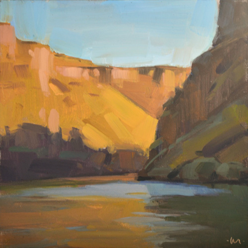 When I set up to paint this in the late afternoon light, I figured the scene was going to change fast. So I painted fast! But the only thing that changed dramatically (the whole freakin' time) was the water. The wind (slight breeze) affected how the water behaved and where/how much it reflected the sky vs. the canyon wall. I actually painted it twice, on 2 different panels, and kept my favorite. Which just happened to be the first one. Go figure. -Carol |