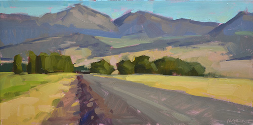 One day I drove down into the valley (just south of Prairie City). I did a few paintings from the side of the road, including this one. At one point a car stopped beside me and an elderly woman stuck her head out and suggested I come back later to paint Strawberry Mountain when there was snow on it. Yep. |