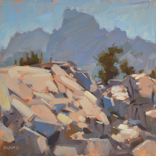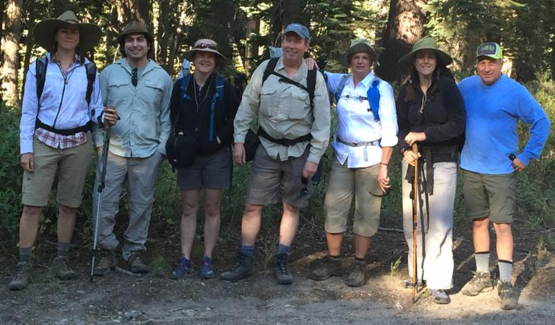 Well, we survived the mountains, but only barely. No bears or mountain lions. And though we saw lots of smoke from the fires around us, we never saw flames. Unfortunately the only disaster was a fall at the end, on the hike out. My new buddy Paul Kratter fell down a steep, slippery section of trail, dislocated his patella and broke his femur. The poor guy had to be hauled out by helicopter.Here's our cast of characters (left to right, photo taken at the beginning of the trip): Aimee Erikson, Ernesto Nemesio, me, Bill Cone, Lori Putnam, Suzie Baker, Paul Kratter. More photos and paintings to come!