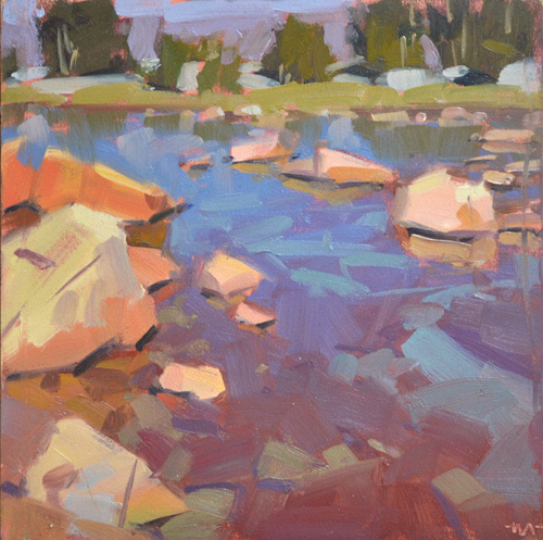 This is a study of a spot about 40 minutes (hiking uphill) from our base camp (in the Sierra's). There was something about the minerals in the water (just below a glacier?) that made the rocks under water this lovely red color, and the sediment at the bottom a kind of turquoise. Such a fun study in compliments!