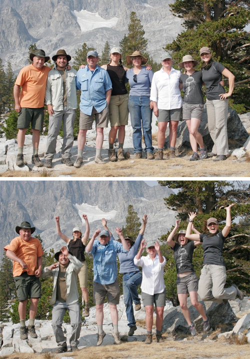 This is the last finished painting I have to show you from my trip to the Sierra's. I did it the last morning, before breakfast and before we packed up and hiked out. And since I'm showing you the last one, I also wanted to show you a couple of group pictures we took, before the hike out (and Paul's leg breakage - who's healing up quite well, btw). Fun, huh?