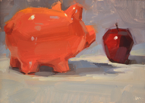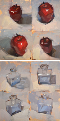 I had a friend painting with me in my studio for a few days last week. I was telling her about my 10-minute apple exercise and we decided to do it together for practice. I started with an apple and then moved on to a bottle. And even though I've painted hundreds of each, I still learned stuff.