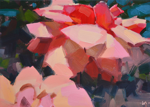 This was a tough one because although the flowers were just about perfect and needed very little editing, the background was a mess. First I tried painting it just like the photo, but the background was too distracting. After trying lots of things, I ended up graying and darkening the background roses (because they were taking too much attention away from the two main ones), and simply painting and repainting the rest of the background until it worked. I admit this is an instinct kind of thing. I wish I could explain it better. But I really like the result - it's both abstract and not, which is fun!