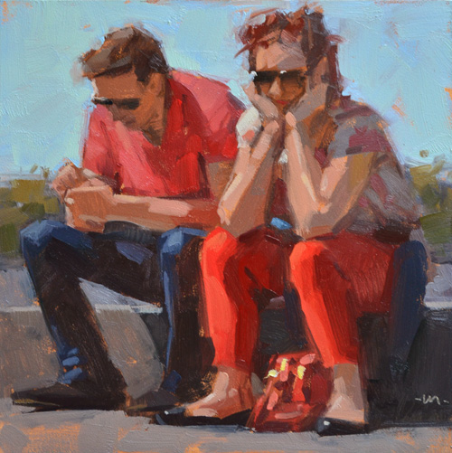 This is a scene from a park in San Francisco. There was a solid gray granite wall behind them, but after trying a few other things (that didn't work), I turned it into bushes and sky.