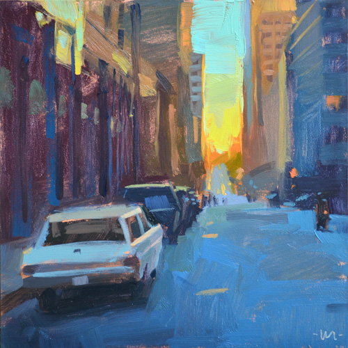 I took the photo reference(s) for this when I was teaching in San Francisco last year. My class had been taking pictures in the downtown area and I decided to walk back to my airbnb apartment rather than catch a ride. Along the way the sun went down and I got a whole series of wonderful shots. I could never capture the nice light on the buildings and the sky in the same shot, so I used several photos to create this scene. My goal is to do this one again bigger, at some point.