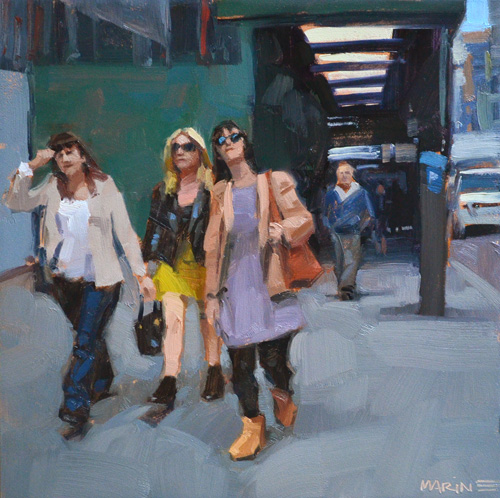 | This is a scene from New York City. These gals were just coming out of the construction tunnel, getting a good view of the skyline. I imagine they were in town for the weekend, a bit of shopping, a bit of partying. Just like Sex in the City! Except where's the fourth girl? They're probably meeting her in a cool bar somewhere.