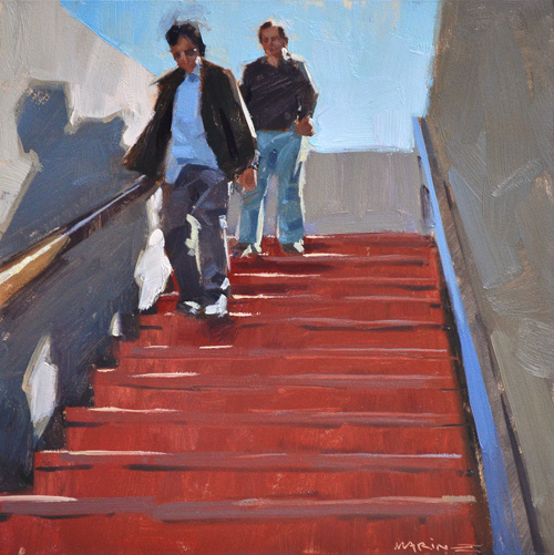 | I caught these two guys heading down to the underground train in San Francisco a while back. I love the back light, the shadow, and the movement the scene captures. And the rails. : ) I can't say enough how much painting as much as I can from life has helped me interpret the photos I've taken.