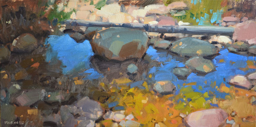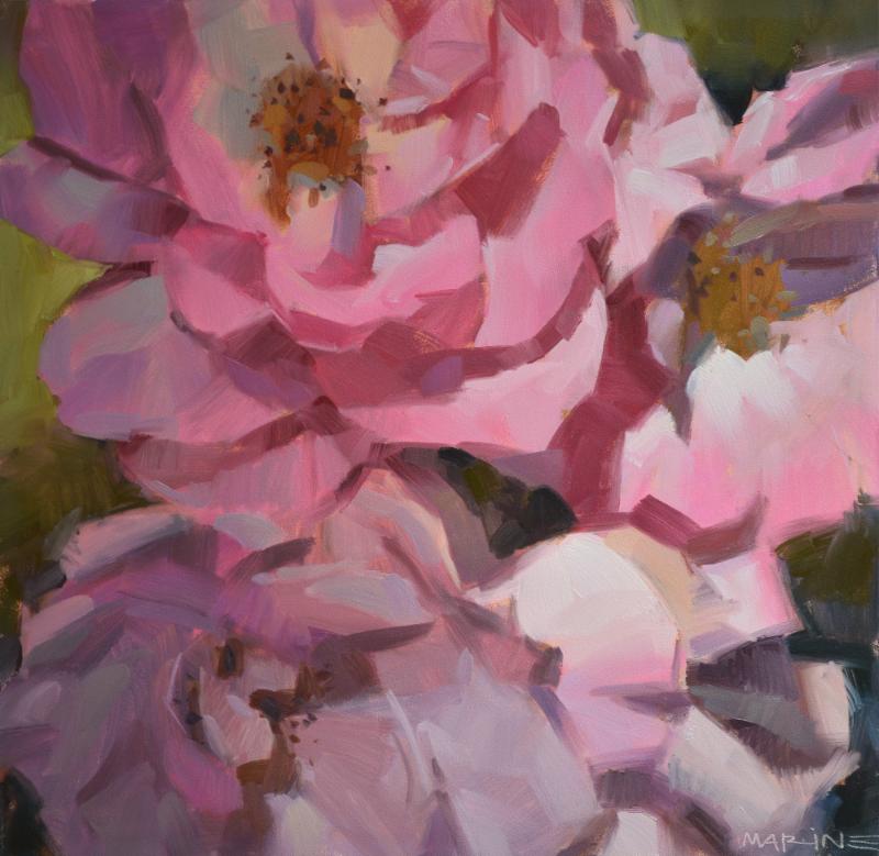 I took the photo reference for this one in Tucson 2 weeks ago, at Catalina State Park. I used a lot of what I learned from the various landscape demos I saw at the Plein Air Convention, tried some new things, and some new brushes. And I'm pretty thrilled with the result! More on this soon... I also wanted to show you one of the paintings from my current show (below: "Patterns in Pink" 12x12in. $700). My plan is to post them all here, eventually. Show sales will go through the Karin Clarke Gallery (541) 684-7963.