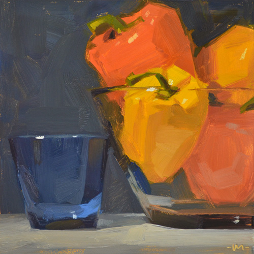 This is the last of my bell pepper series. My house guests arrived the day after I painted this one, and I discovered the peppers, 10 days later, completely abandoned in my shadow box, slowly decomposing into the bowl. Woops!