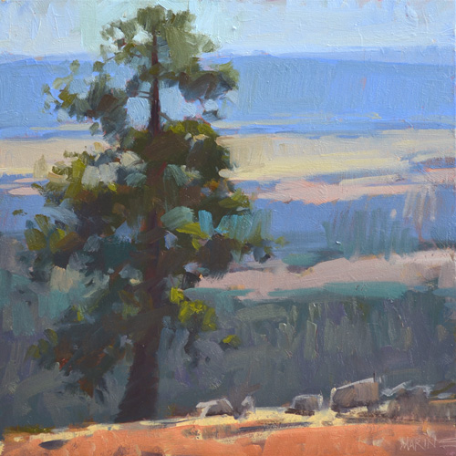 In one week I'll be driving to California, hiking up into the mountains, and camping/painting for 5 days with friends. To get my body ready, I've been hiking up to the top of our local butte (Spencer's) with my pack. And while I'm up there, I also practice painting. This is the first painting I did up there. This is our dry season here in Oregon - the darker layers are trees, and the lighter layers are golden fields.