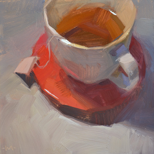 When I got home from the mountains I had a hankering to paint some still life. I had been using a block-in first method outside, and decided to try it on some cups. It was a horrible failure and I wiped it off immediately! And then did a few more wipers for good measure. It was late so I wrote a note to myself for the next day to "slow down." This was the first one I did the next morning. It was like a meditation, and just what I needed.