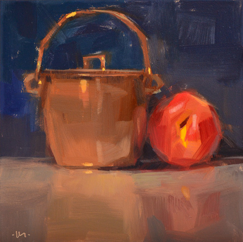 Copper and nectarine make the perfect pair, hey? I pulled out my dusty old piece of glass for the reflections. I forgot about it but I used to do this all the time. Like this one, and this one. At this angle (not quite eye level), the reflections are vague still, which I like, but it's also difficult to paint. The trick is to squint and compare, compare, and compare some more.