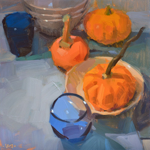 Recently I started a painting of a German city-scene and got interrupted right in the middle. It was also right smack-dab in the middle of its "ugly phase." It sat on my easel for days after, very distinctly NOT calling to me. So I finally went and got something - anything! - else to paint. Eventually I'll get back to the city-scene. But for now, pumpkins.
