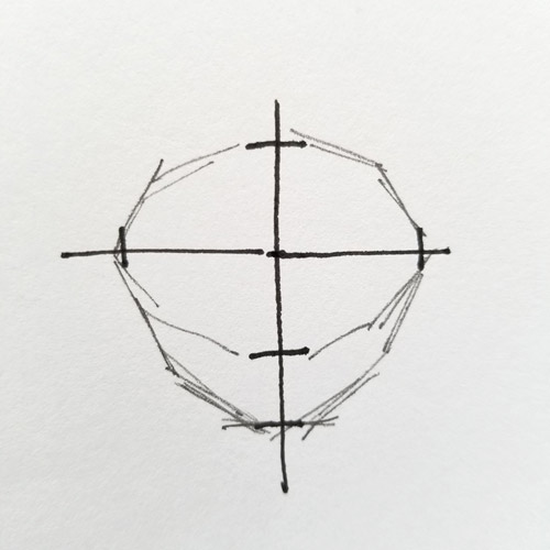 The idea of drawing the dashes first and only completing the cup once you are sure these are correctly placed is to save you the effort and heartache of painstakingly perfecting your cup only to realize it needs to be moved over 1/4". Been there, done that?The "cross" helps to ensure that your proportions are correct. Handles come next.