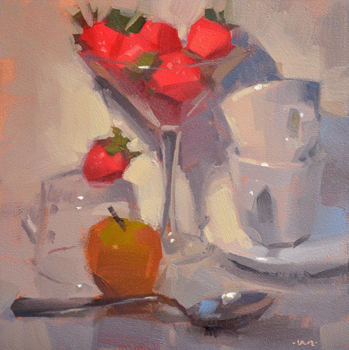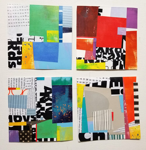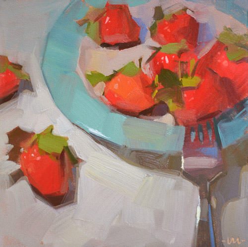 Also, here is one more strawberry painting. And below, four of my little abstracts (excited!). Instead of doing one a day I've been doing several. What's nice about that is if one or more is ... "eh," I don't mind. Actually there's a LOT of stuff I have to say about this whole process, so I'll keep notes and write something comprehensive at the end. Also, I'm thinking I might devote next month to something new - maybe watercolor! And keep going like that, all year? We'll see. So far I'm really enjoying it.