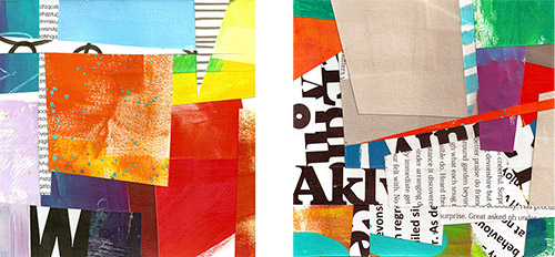 I've done oodles and oodles of abstract collage lately, and I think I'm finally ready to offer them up for sale. I experimented today with getting good images of a couple. I found that scanning was best, although no matter what I tried I couldn't get the oranges to come out right. In the image (below) to the left, the middle piece is a brighter, more saturated orange. And in the right one, the three red pieces are actually orange. Is it my scanner? Is there a better way to do this? Does anyone have any experience photographing collage? I would really appreciate any suggestions. Thank you!