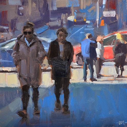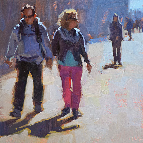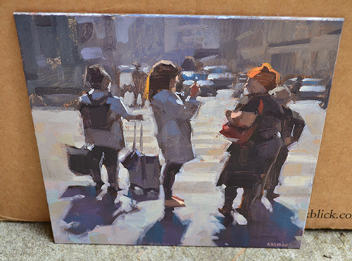 The other day I spent hours doing a painting of a similar scene, with just one gal in the foreground, in shadow. It was on a bigger panel, a more complicated scene, and at the end of the day I couldn't find enough good in the painting to keep it. My husband said it was weird that the gal in the foreground was in shadow. But, call me stubborn, I had to try again. I like this one a lot more. That's not to say it wasn't hard as heck! These faces are not only tiny, the values are super duper subtle.